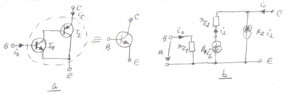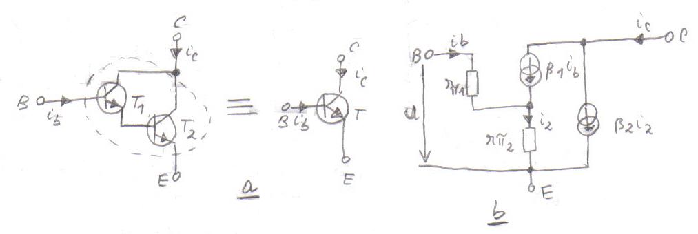 diferite ( in figura T1 - npn, T2 - pnp ( de putere), dau un tranzistor echivalent